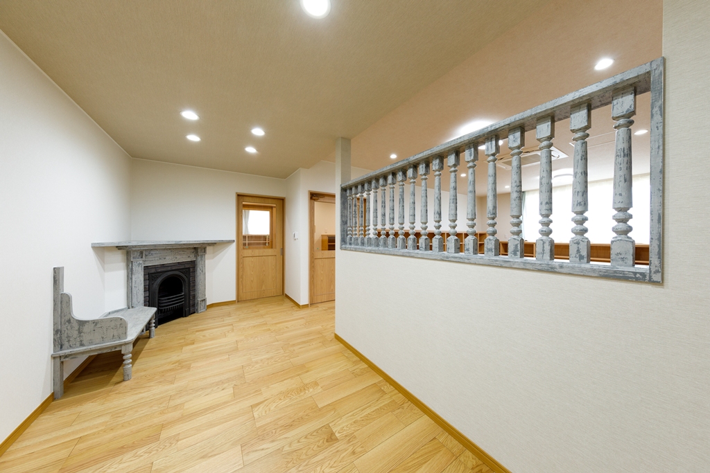 旧園舎の寄棟の屋根とアーチの意匠を取り入れ、貸出室にも旧園舎からの暖炉と手摺子を移設、エイジング塗装を施し、園の歴史と思い出を継承しました。