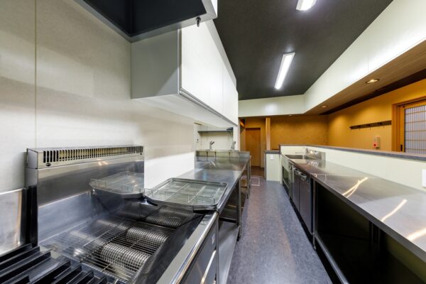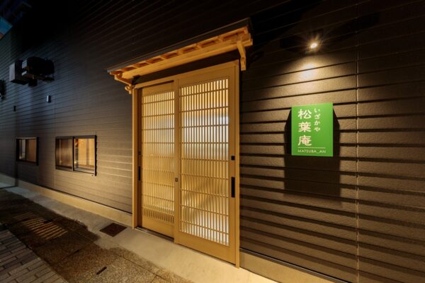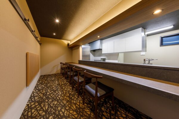 下関市の唐戸にある和食のお店です。黒の外観に照明と格子の引き戸から灯がこぼれ、思わずふと目をうばわれ足を止めたくなります。無垢の格子や庇は自然の木の風合いが活かされており、店内も欄間やニッチのアクセントクロスなど、和の雰囲気を大切にしました。