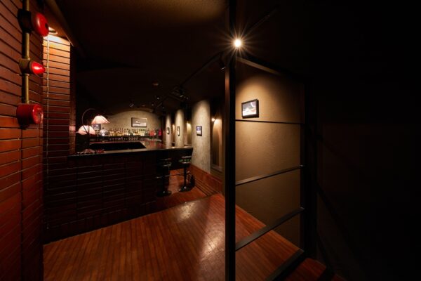 内観は落ち着いたバーの雰囲気を実現する為にマテリアル素材は「塗り壁」「木」調「レンガ」に限定。照明計画もオーナー様コダワリの絵画が主役になるように器具や配灯の計画を行った。