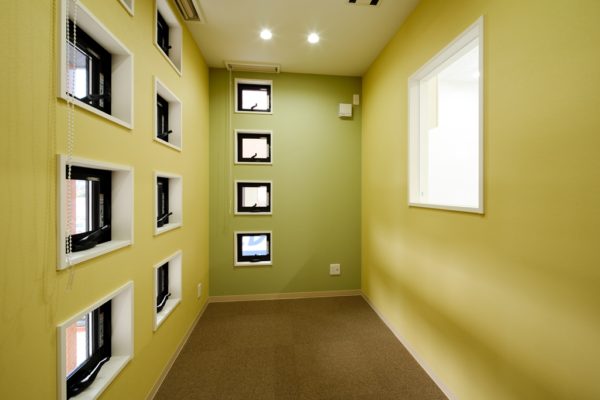2階の歯科技工エリアは廊下から模型室、鋳造室、技工室といった業務室が全て可視化されており、技工室からも築盛室、レーズ室が見える化されています。