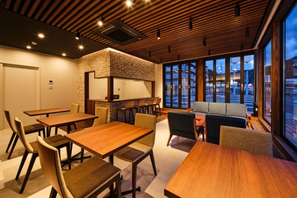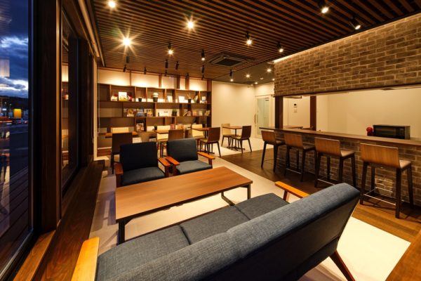 1階の休憩エリアは、スタッフの憩いの場だけではなく、イベント活用なども視野に入れ、caféのような空間に仕上げています。外部の木格子の木の風合いを天井ルーバーに繋げ、壁面一面を本棚の造作で仕上げました。カフェでランチをするようなくつろぎの空間です。