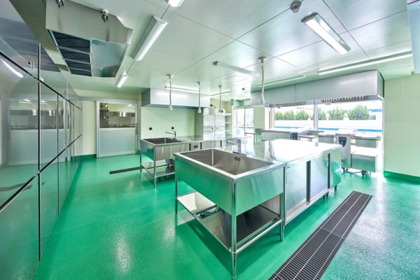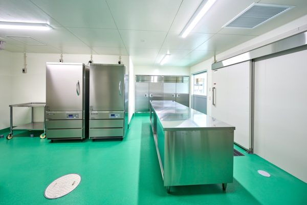 ・返却皿等を洗浄する洗浄ゾーンを1wayとするが分離を行える空間、調理の終わった商品の出荷にも使える空間として比較的広い前室を設ける。