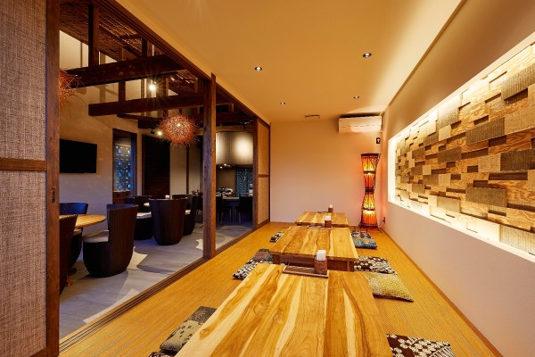 バリアンリゾートをコンセプトに、レストラン・バー・パーティーと多用途に活用できる空間に。天井や照明などにバンブーを用いてバリテイストを表現。外観から見える、個室のアクセントウォール、バンブーペンダントランプの光を象徴的に見せる為、正面に大きなFIX窓を配置しました。家具以外はすべて、日本素材・日本の手(職人)で作り上げられたこの空間は、インドネシアの素材・手によって作られた家具・照明と融合し、どこか懐かしさのあるアジアの空気を感じる雰囲気となりました。家具・意匠照明はすべてインドネシアからの直輸入です。(2018年12月に増築工事完了。)