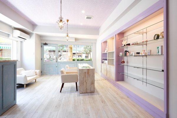 フレンチアンティークをコンセプトに、基本の色味はホワイトを使い、ブルーやパープルのシャビーシックな家具を合わせ、落ち着いた空間に。