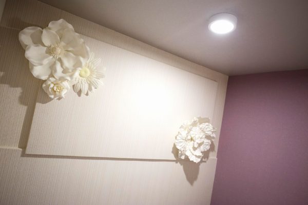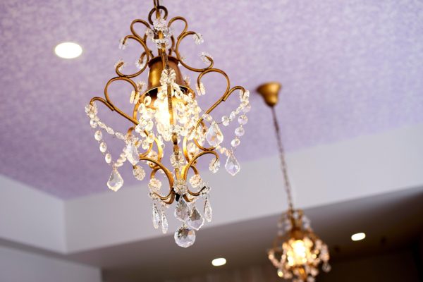小ぶりなシャンデリアや天井に使用した意匠的な柄クロスをアクセントに演出。
