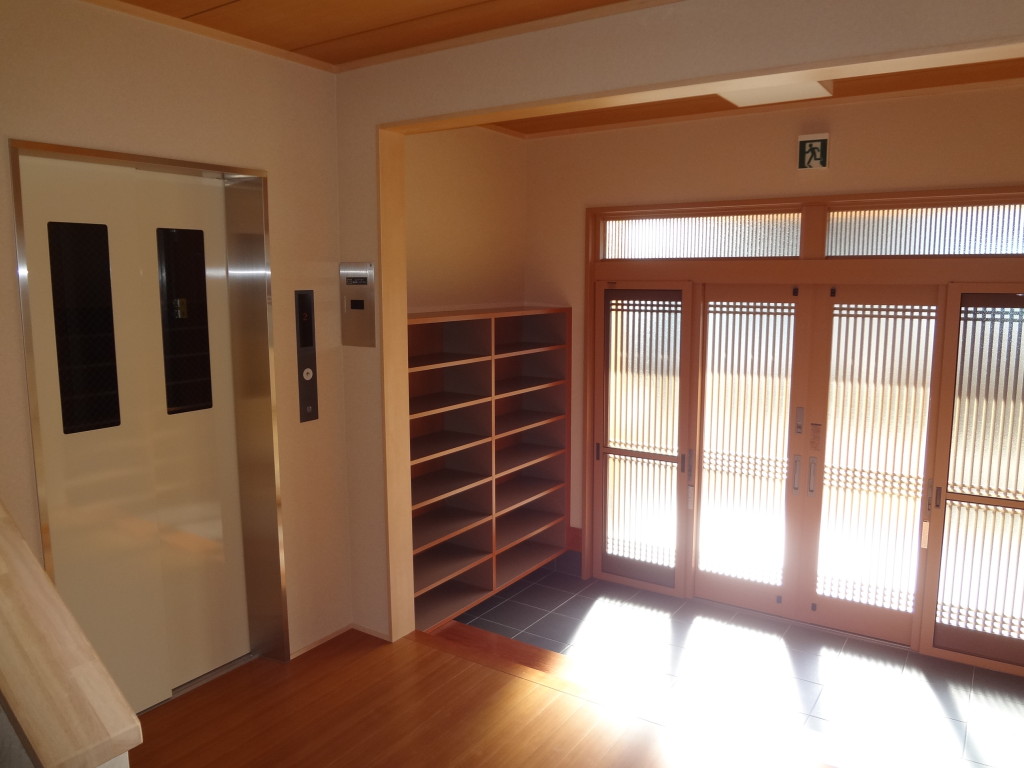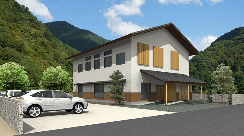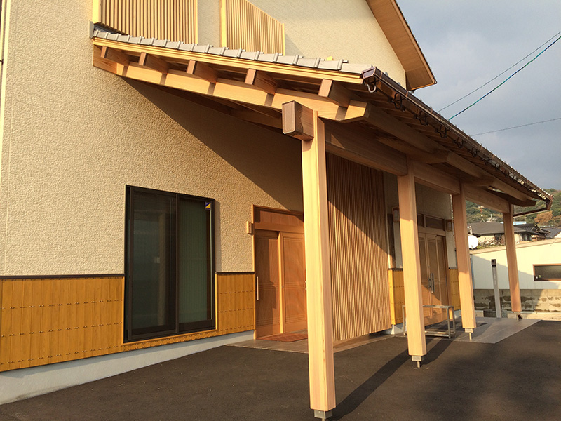 下関市内の寺院、恵照院新築工事です。1階にご住職のご自宅があり、2階が本堂の為、玄関を2ヶ所設け動線を分離しました。建物は全体的にナチュラルな感じにしましたが、切妻屋根なのでシンプル過ぎないよう下屋を造り、アクセントとして無垢材をふんだんに使用しました。尚、玄関の柱、梁は銘木である吉野杉の赤身を採用しましたので重厚感ある仕上がりになりました。内部にはEVを設置し、バリアフリー化も実現。2階本堂は無柱空間とし、天井高を高く計画しましたので開放的な空間になっています。