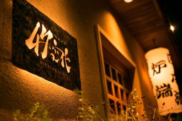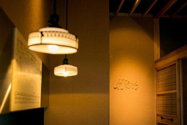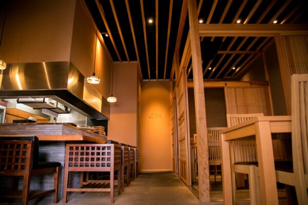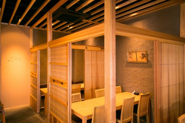 下関市内の竹崎町、三角公園の隣のビルの1階にある和食のお店です。天井縦格子・桜の一枚板のカウンター・個室の簾戸・本物の土壁、杉皮葺きの屋根と、モザイクタイルやステンレスのヘアライン仕上げのフード・ロートアイアンの看板の組み合わせによる和と洋の調和が、洗練された上質な空間を演出しています。また、調光タイプの照明器具は各シーンに対応した雰囲気をしつらえます。