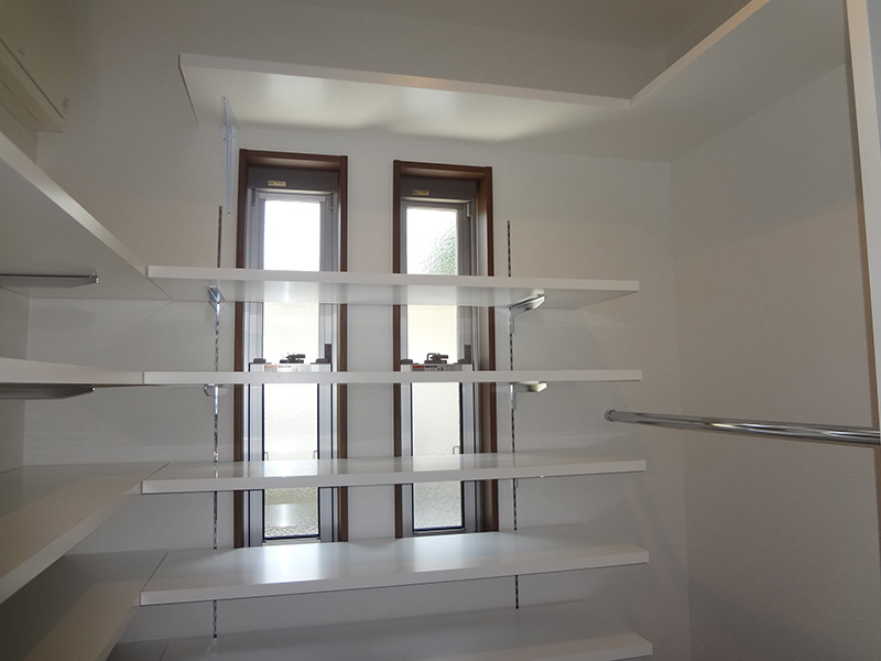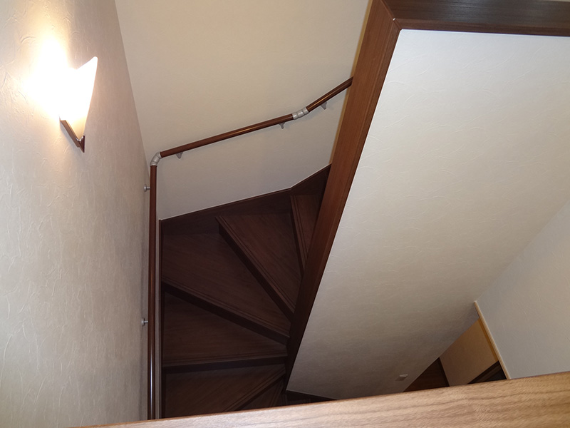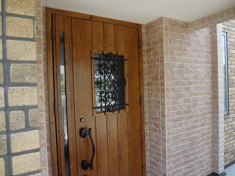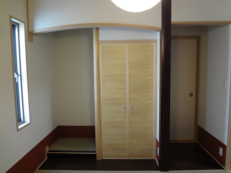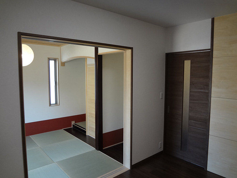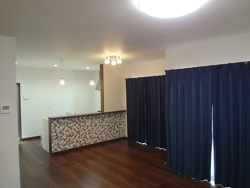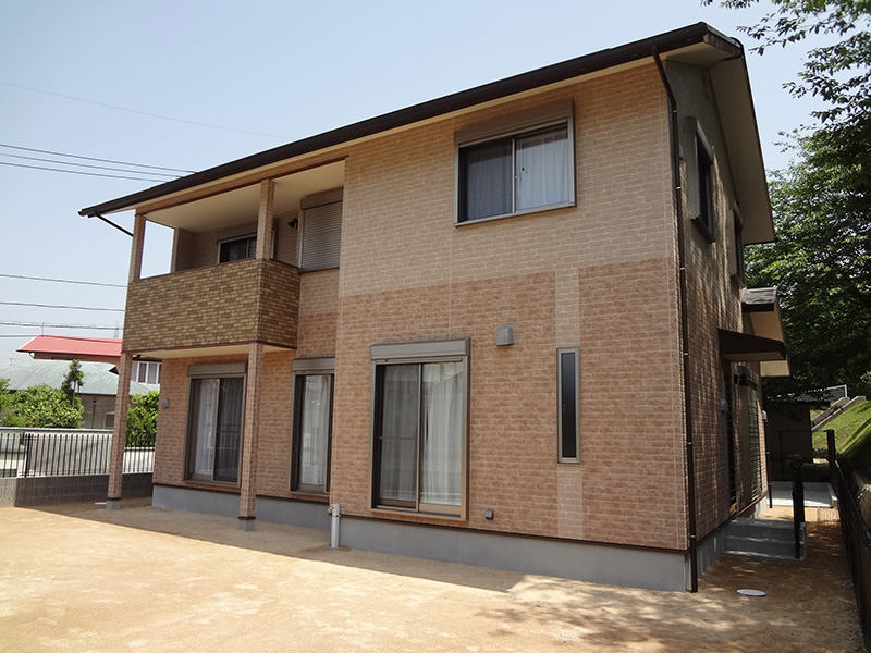 下関市内のM様邸の新築工事です。アプローチを現在の位置にするため、擁壁工事からの施工となりました。外部はお施主様ご希望のタイル調で仕上げています。内部は白を基調とし、フローリングに少し濃い目のブラウンを入れることでめりはりをつけました。和室には桧の錆丸太を使用し、クロスの切り替えでアクセントをつけ、和モダンな空間を演出。